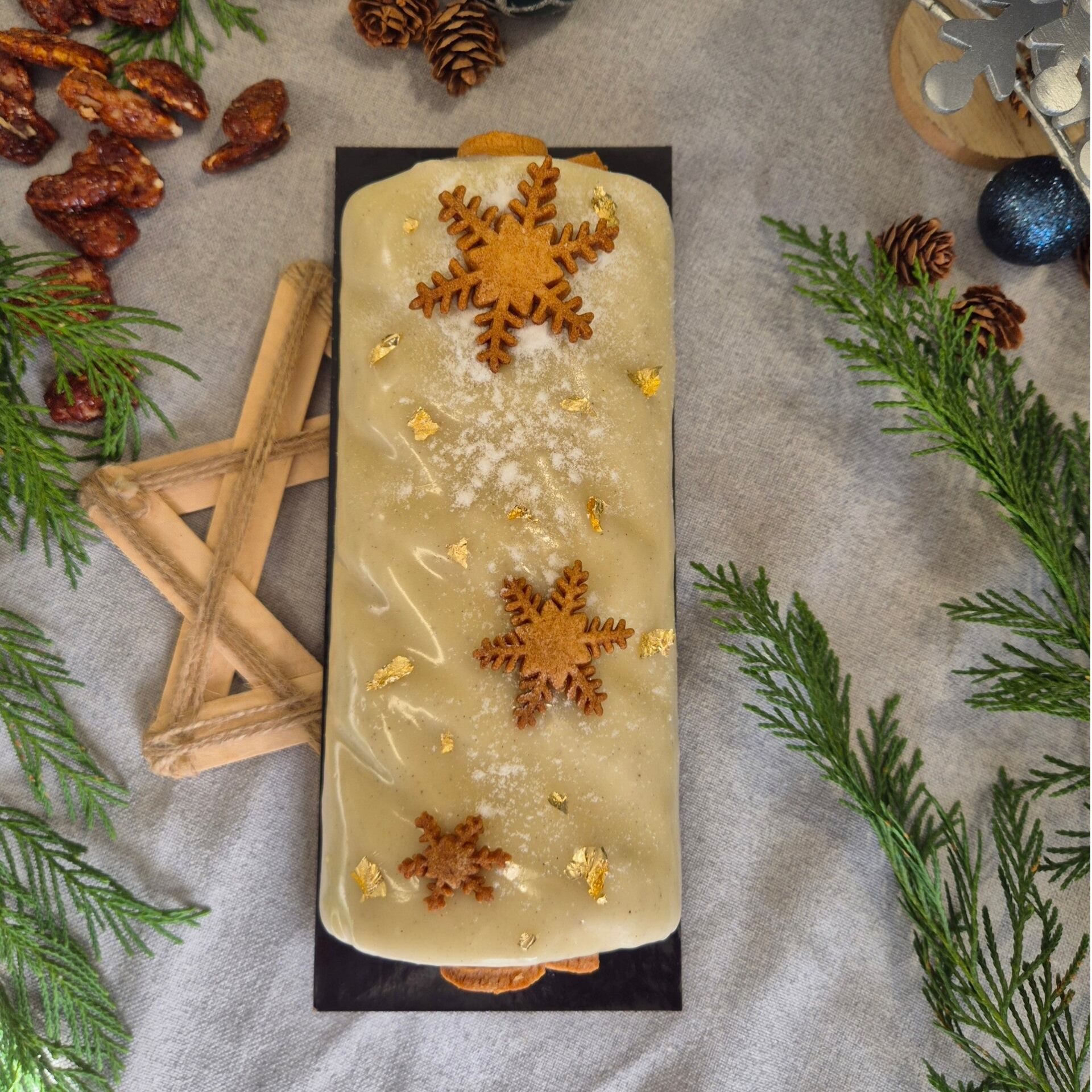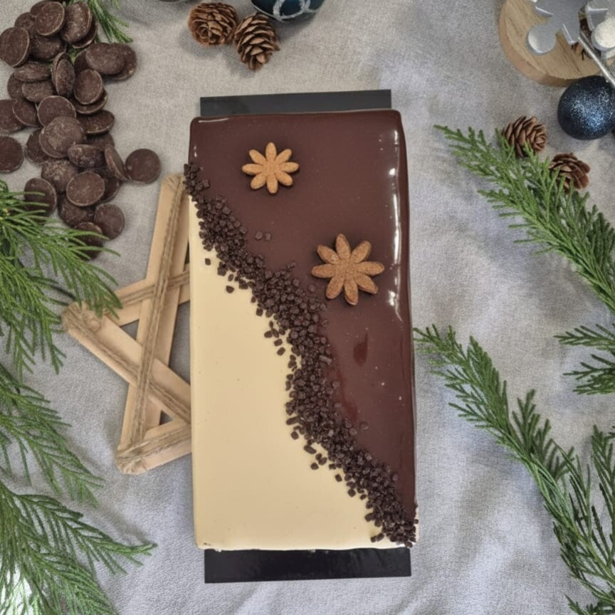Ganache légère chocolat blanc et vanille, caramel onctueux, éclats de noix de pécan caramélisées, biscuit moelleux, glaçage chocolat blanc vanille.